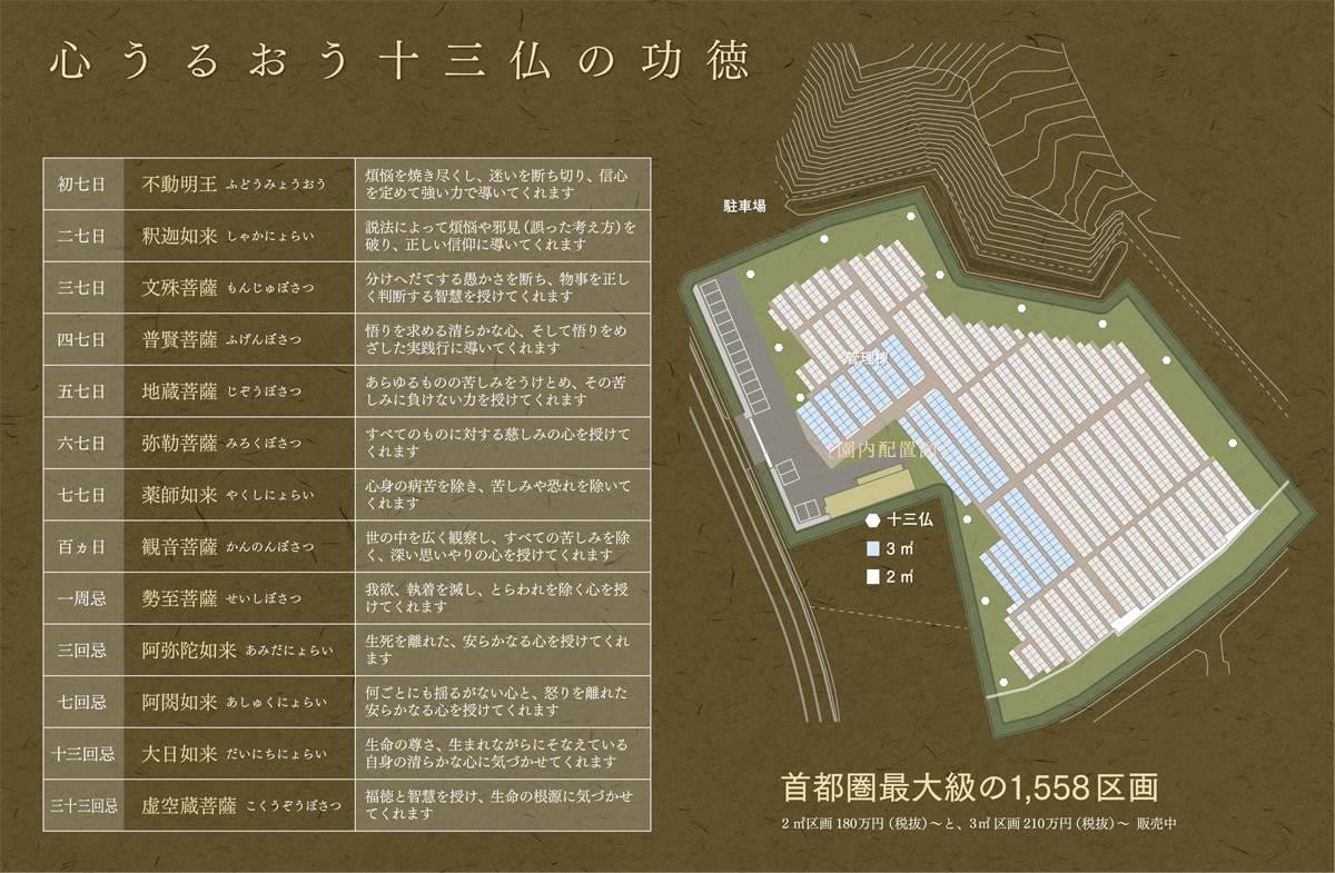 印旛日本医大駅前から車で約5分、都心から約1時間のアクセス。十三仏の慈悲と緑に囲まれた大型霊園。宗旨宗派は問いません。◎管理棟・法事ホール